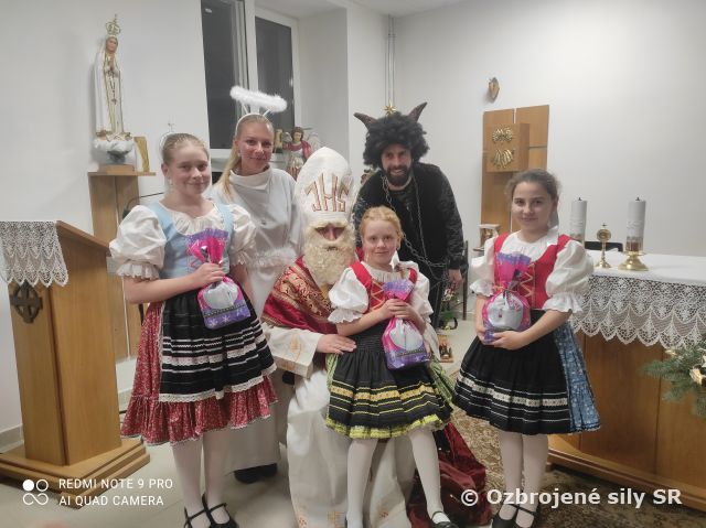 V kaplnke sa poschádzali deti profesionálnych vojakov a zamestnancov, ktoré túžobne očakávali príchod Mikuláša a jeho družiny. Ako to už býva zvykom, deti najprv prišiel "postrašiť" čert, ktorý ich nahováral na rôzne nezbednosti a huncútstva, ale v kaplnke sa zišli len dobré deti, ktoré čertovým lákavým ponukám odolali. A oplatilo sa, pretože túžobne očakávaný Mikuláš prišiel s pomocníkmi a obrovským vrecom sladkostí. Vypočul si od detí básničky alebo pesničky a na oplátku im rozdal maškrty. Všetci si mohli pochutnať na koláčikoch a vianočnom punči. Za príjemné popoludnie a výbornú náladu ďakujeme folklórnemu súboru Jurošík zo SZUŠ v Michalovciach. Atmosféru umocnili aj vianočné rozprávky a mikulášske pesničky.